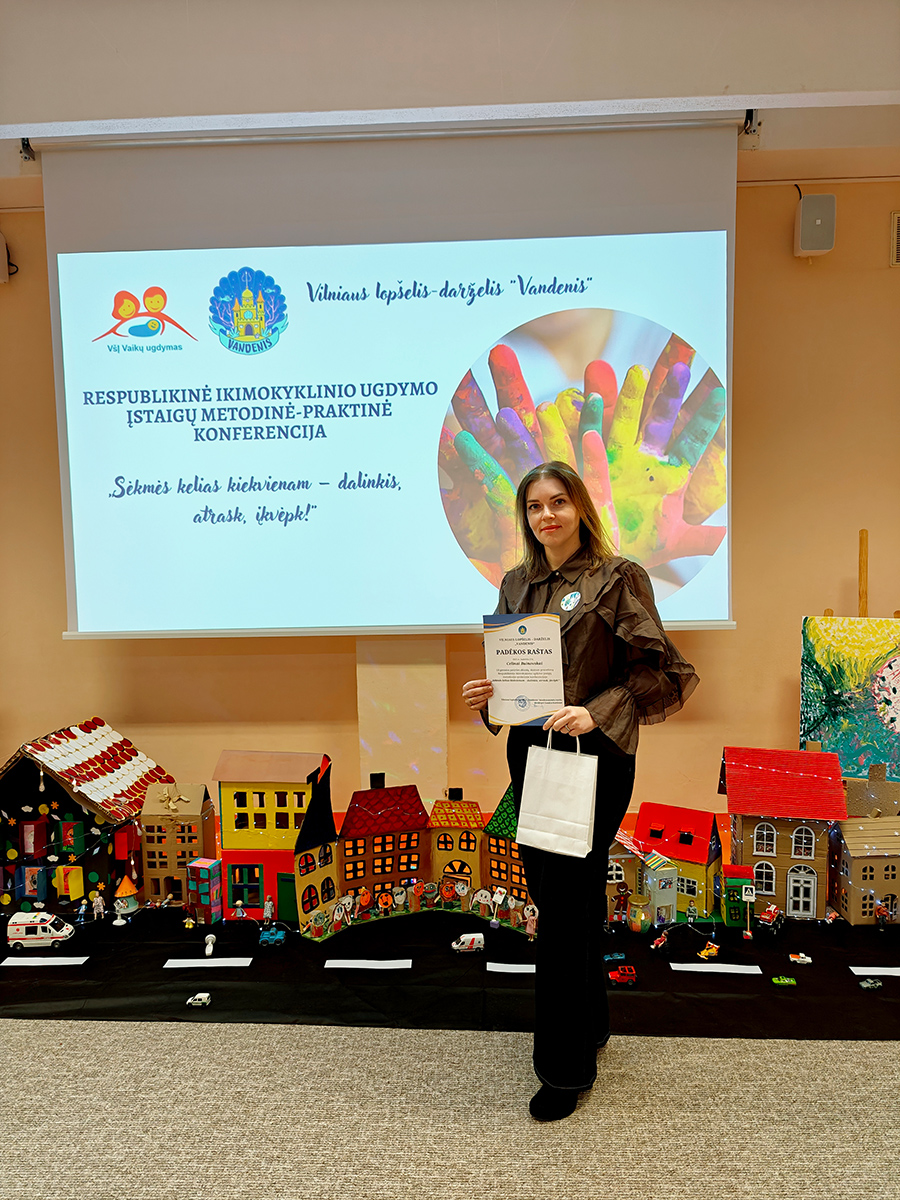 Lapkričio 27 d. Vilniaus lopšelyje-darželyje „Vandenis“ vykusioje Respublikinėje ikimokyklinio ugdymo įstaigų metodinėje-praktinėje konferencijoje „Sėkmės kelias kiekvienam – dalinkis, atrask, įkvėpk!“ direktoriaus pavaduotoja ugdymui, socialinė pedagogė Celina B. pasidalijo gerąja Vilniaus r. Maišiagalos vaikų lopšelio-darželio patirtimi, pristatydama žodinį pranešimą tema „Ugdomosios aplinkos kiekvienam“.