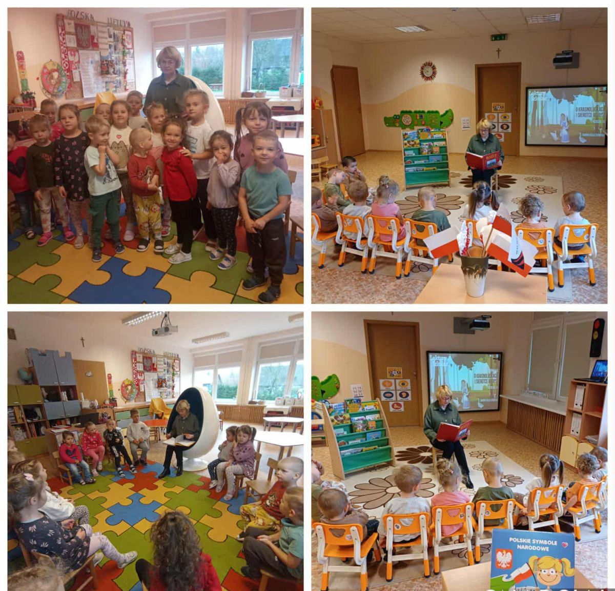 Placówka wzięła również udział w ogólnopolskiej inicjatywie „Szkoła do hymnu”, uroczyście śpiewając „Mazurek Dąbrowskiego”. Wyjątkowym wydarzeniem było także spotkanie z bibliotekarką, panią Aliną Jodko, która zaprezentowała dzieciom baśń Marii Konopnickiej „O krasnoludkach i sierotce Marysi”, wprowadzając je w świat klasycznej polskiej literatury.
