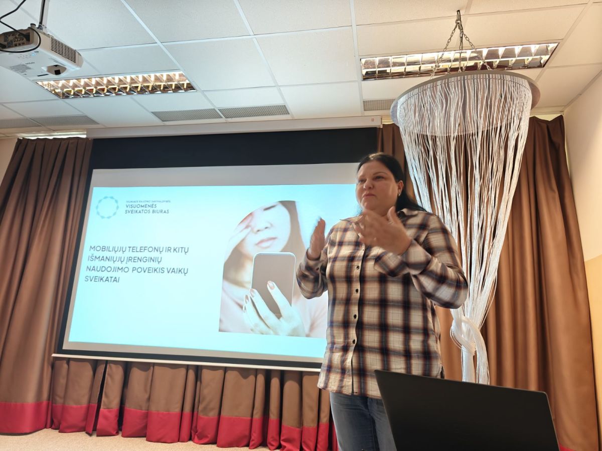 - „Mokinių mobiliųjų telefonų ir kitų išmaniųjų įrenginių naudojimo poveikis sveikatai“ – pranešėja buvo Vilniaus rajono visuomenės sveikatos biuro specialistė Neringa Ališauskienė.