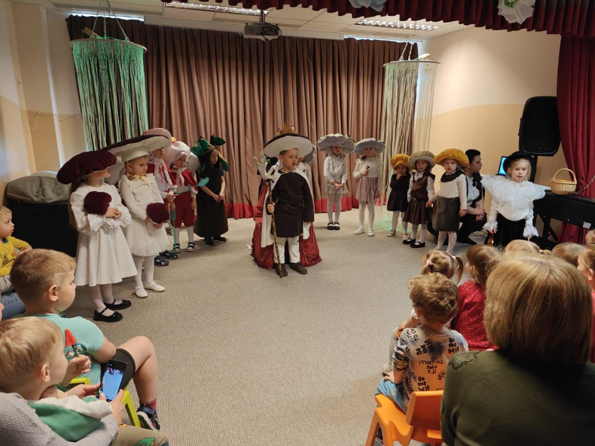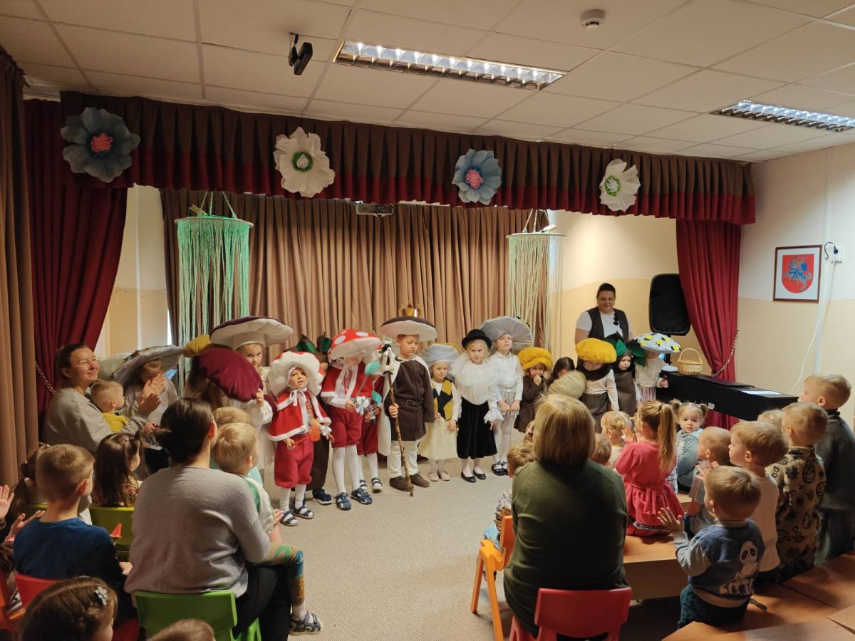 Dzisiaj sala widowiskowa naszego przedszkola zamieniła się w barwną, leśną polanę. Wszystko za sprawą grupy „Krasnoludki", która przygotowała inscenizację kultowego wiersza Jana Brzechwy pt. „Grzyby".